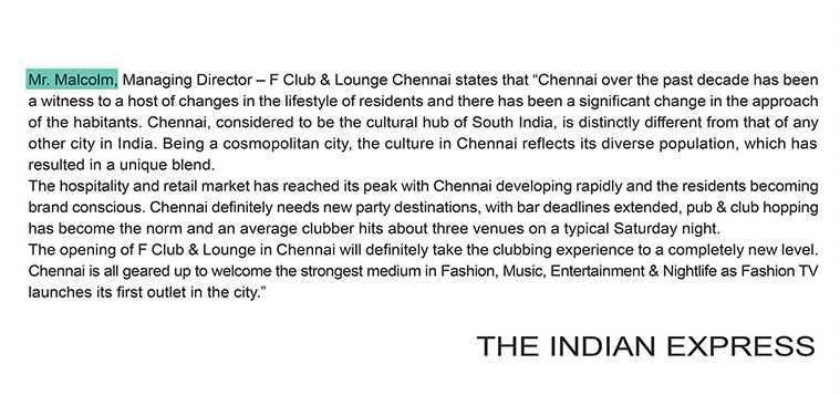 Malcolm took up the franchise of Fashion TV Hospitality in 2014 and was interested in opening an upmarket Night spot which Chennai needed. A 6500 sqft space in shell condition was finalized at Le Royal Meridian, Chennai. The F - Club & Lounge was conceptualized and space planned by Malcolm in two levels - Night Club and Alfresco zone. After the interior works were complete, the technically most advanced night club in Chennai was launched in June 2015.
